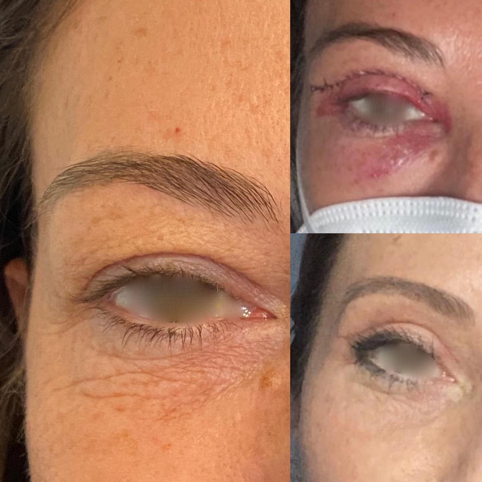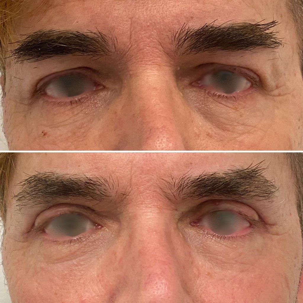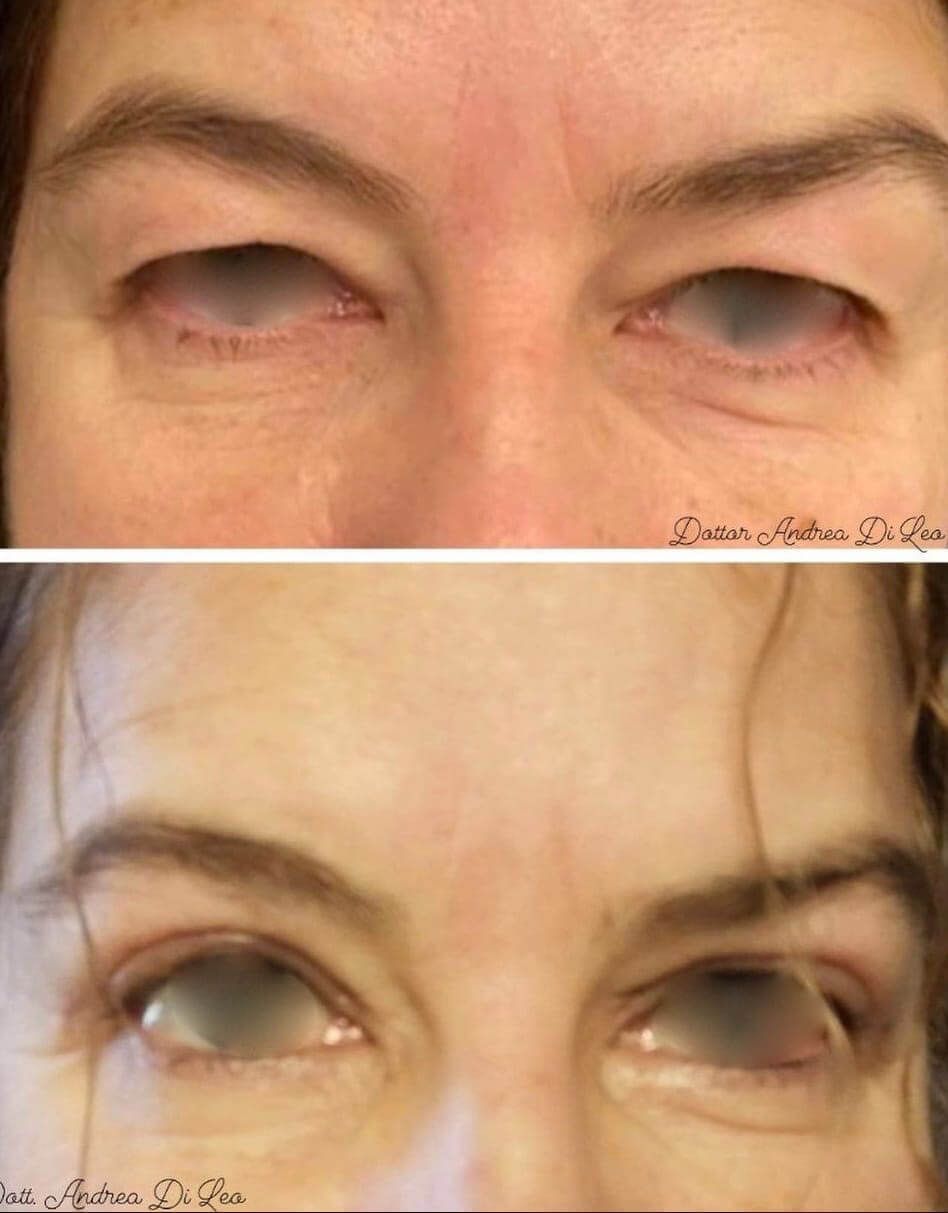Prima e dopo di un Intervento di ectropion, una condizione in cui la palpebra inferiore si rotea verso l'esterno, distanziandosi dal bulbo oculare.