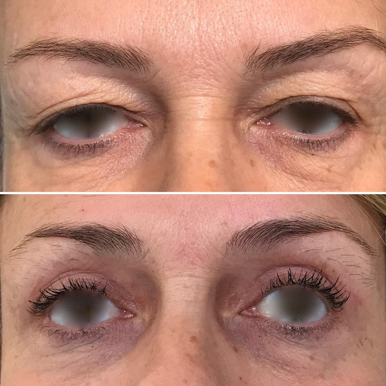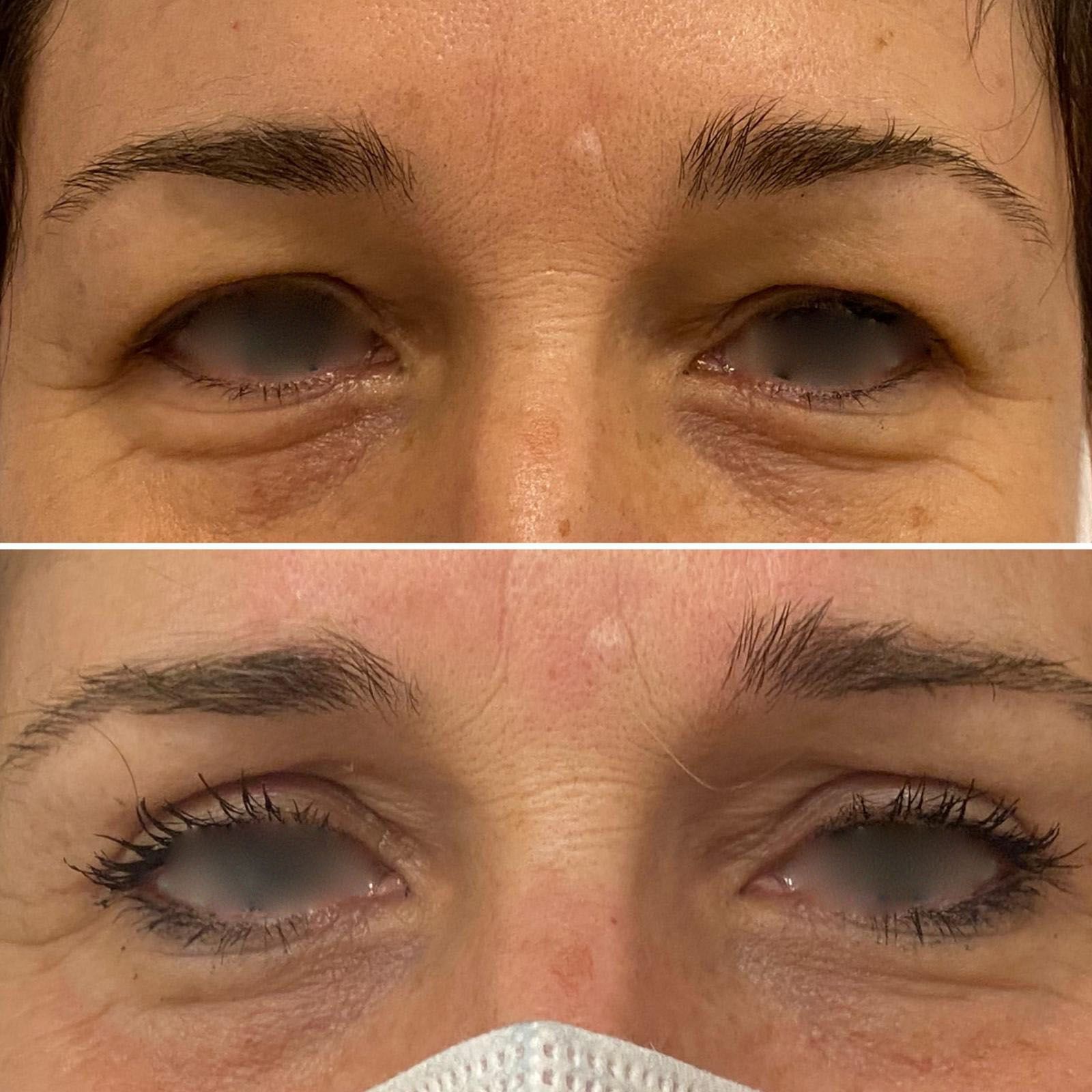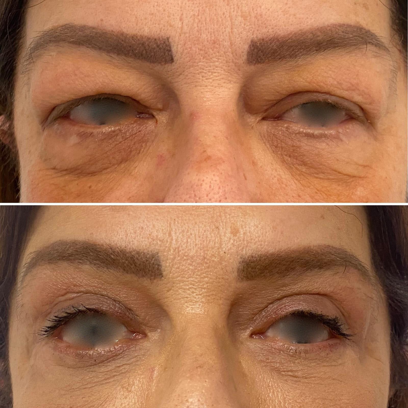 Prima e dopo di un Intervento di ectropion, una condizione in cui la palpebra inferiore si rotea verso l'esterno, distanziandosi dal bulbo oculare.